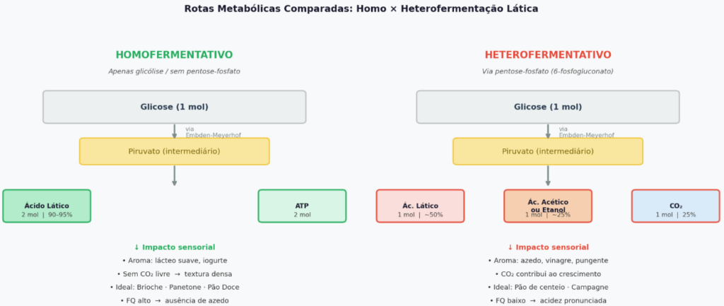 A rota heterofermentativa obrigatória, por outro lado, passa pela via das pentoses-fosfato (6-fosfogluconato). O resultado é uma divisão tripartida: aproximadamente 50% do carbono vira ácido lático, 25% vira ácido acético (ou etanol, dependendo das condições redox da massa) e 25% vira CO₂. Esse CO₂ contribui com volume, o que explica por que os heterofermentativos são tão valorizados em pães de estrutura aberta. Mas o ácido acético, mesmo em concentrações muito baixas, tem um limiar de percepção olfativa e gustativa significativamente mais baixo do que o ácido lático. Uma concentração de 0,2% de ácido acético livre na massa já é perceptível sensorialmente; a mesma concentração de ácido lático mal altera o perfil.