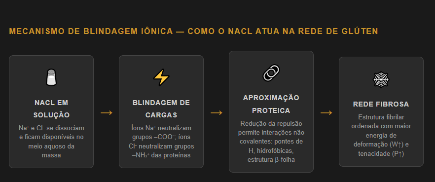 Quando o NaCl se dissolve na água de hidratação, ele se dissocia completamente em íons Na⁺ e Cl⁻. Esses íons competem com as moléculas de água pelos sítios de ligação na superfície das proteínas e aqui reside o primeiro efeito paradoxal e contraintuitivo do sal na massa: ele reduz levemente a absorção de água da farinha, porque desacelera a hidratação das proteínas (Na⁺ e Cl⁻ ocupam sítios que seriam preenchidos por moléculas de água). Essa hidratação mais lenta, no entanto, resulta em um glúten mais organizado: as proteínas têm mais tempo para se alinhar antes de se fixar definitivamente, e a rede que se forma é fibrilar, coesa e capaz de suportar pressão de CO₂.