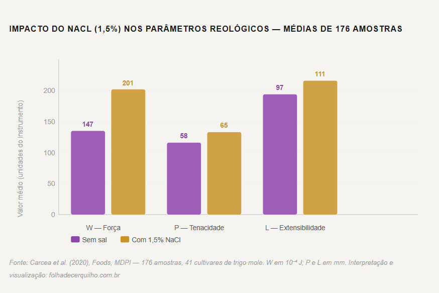 O estudo italiano de Carcea et al. (2020) usou dois instrumentos clássicos de reologia empírica, o Farinógrafo Brabender e o Alveógrafo Chopin, para medir em 176 amostras a diferença entre massas com e sem 1,5% de NaCl. Os resultados compõem um quadro que nenhuma receita de panificação artesanal consegue transmitir com palavras.