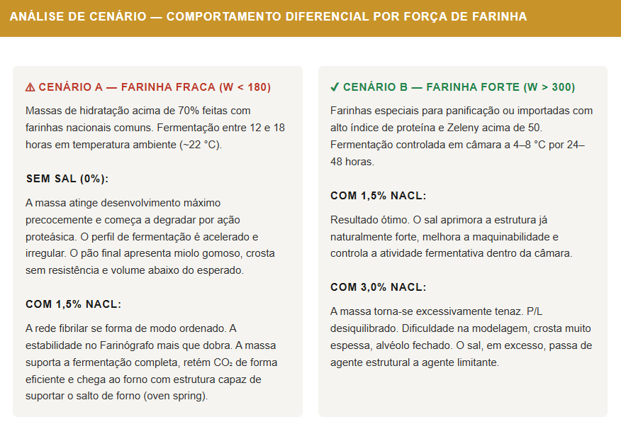 A lição prática extraída dessa análise comparativa é clara: o sal não serve apenas para temperar,k ele calibra o sistema. Em farinhas fracas, ele é o agente que viabiliza a fermentação longa. Em farinhas fortes, ele é o regulador fino que precisa ser dosado com mais atenção. Tratar 2% de NaCl como dogma universal para qualquer tipo de farinha é um erro que produz resultados inconsistentes sem que o padeiro consiga diagnosticar a causa.