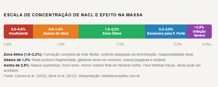 Para completar o quadro com rigor, é importante registrar o que os dados não suportam. O sal não é um melhorador milagroso capaz de transformar uma farinha estruturalmente pobre em uma farinha de alta performance. O estudo de Carcea et al. é explícito: cultivares de glúten muito fraco mostram melhora limitada com o sal, e nenhuma concentração de NaCl conseguiu “salvar” uma farinha com Zeleny abaixo de 20 (indicativo de glúten inadequado para panificação).